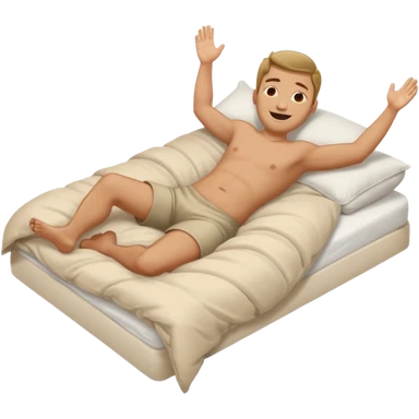 A man in bed laying down under covers kicking feet because excited to sleep arms are down and he is smiling with eyes closed and feet are kicking in air. emoji