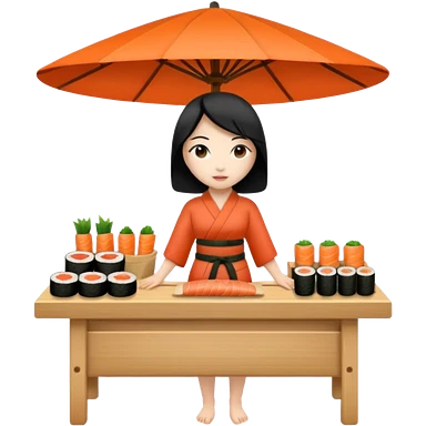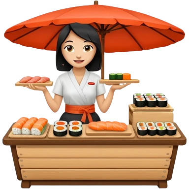 Naked asian female sushi vender on a marketplace; full body emoji