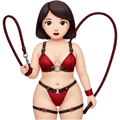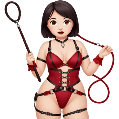 Dominatrix wearing a darkred bdsm style harness lingerie. White skin, chubby, halflong dark hair, hazel eyes. Holding a whip. Looking playfull but bossy emoji