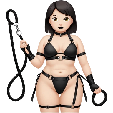 Dominatrix; wearing a shibari style harness. White skin, chubby, halflong dark hair, hazel eyes. Holding a whip emoji