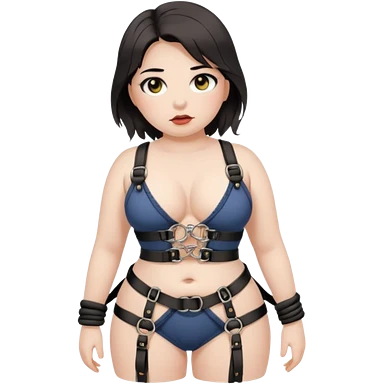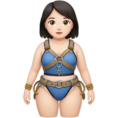 Submissive woman in rope chest harness; full body. White skin, chubby, halflong dark hair, hazel eyes. emoji