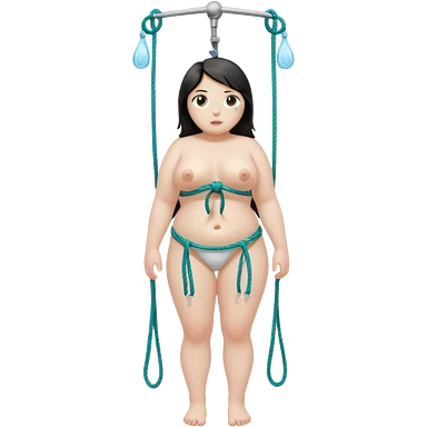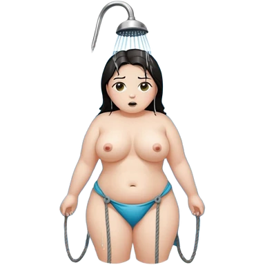 Submissive woman in rope bondage in a shower; full body. White skin, chubby, halflong dark hair, hazel eyes. emoji