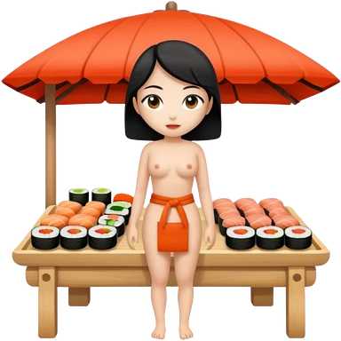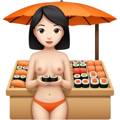 Naked asian female sushi vender on a marketplace; full body; nude emoji
