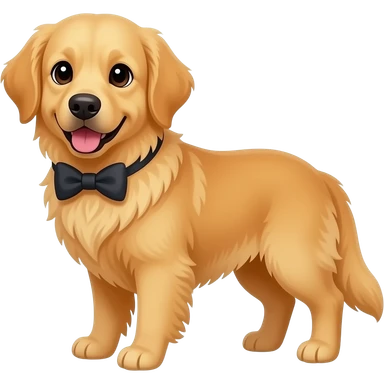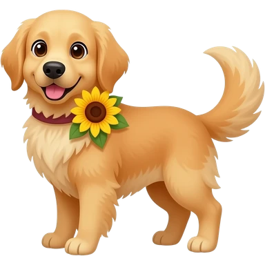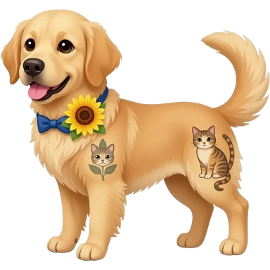 a golden retriever dog with a sunflower bowtie and a cat tatoo emoji