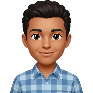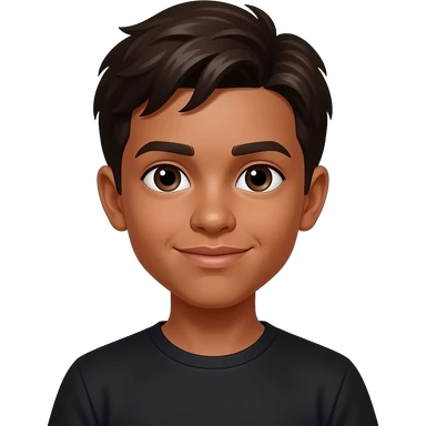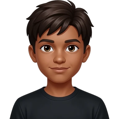 um menino de 13 anos com cara de 12, ele tem cabelo marrom escuro e pele pardo escuro, o olho dele é castanho escuro e ele está usando uma camisa preta emoji
