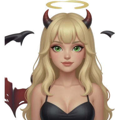 Make an emoji of a cute, busty, green eyes, blond hair (no bangs) white girl with an angel halo, but devilish and dark everywhere else with dragon wings emoji