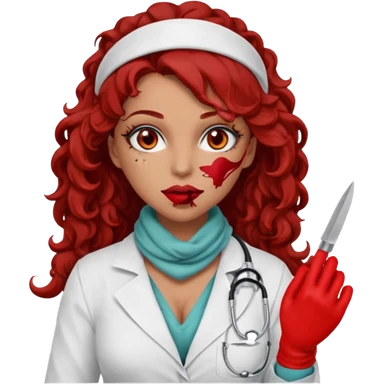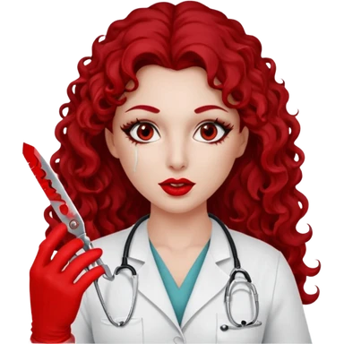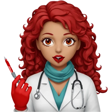 Lilith scalpel in hand, evil surgeon sexy surgeon clothes. She has red eyes. She has dark brown long curly hair. Wears sexy doctor outfit with red gloves. Covers mouth neck and nose with red burka to hide her identity emoji
