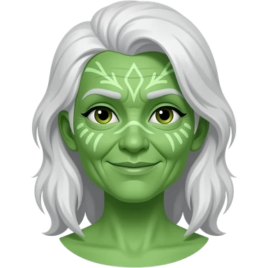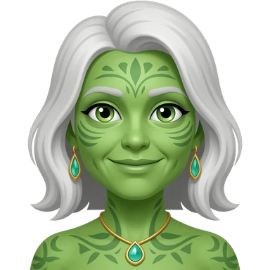 llustrate a Pandora-style old female avatar with radiant green skin, intricate facial markings emoji
