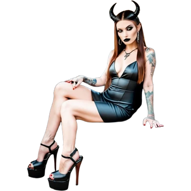 Sensual queen long brown straight haired mafia woman with black shiny platform high heels on her feet, black devil horns on her head, tattoos on arms , holding a human dead man skull. in the back seat of a large big new model F350 pickup truck full of cash wearing long sex dress with big butt emoji