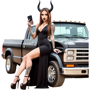 Sensual queen long brown straight haired mafia woman with black shiny platform high heels on her feet, and black devil horns on her head, tattoos on arms , holding a stack of cash, has a phone in other hand. Sitting on a large big new model F350 pickup truck long black dress with sexy butt emoji