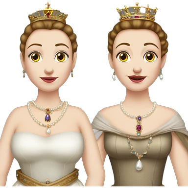 Chubby white 35 year old female queen with large breasts. Dark and tied back hair, eyes light-coloured and a bit wide-set. Elizabethan queen's dress and a lot of jewellery such as pearl necklaces, earrings and a crown. She wears an embroidered sash. emoji