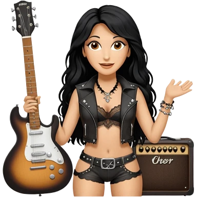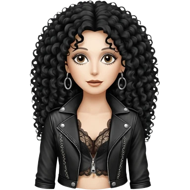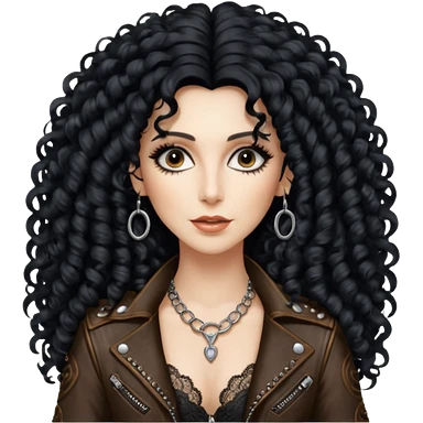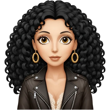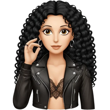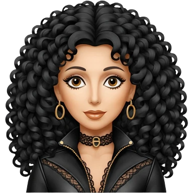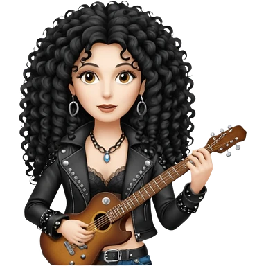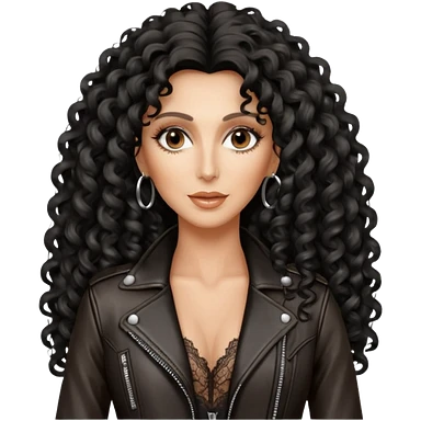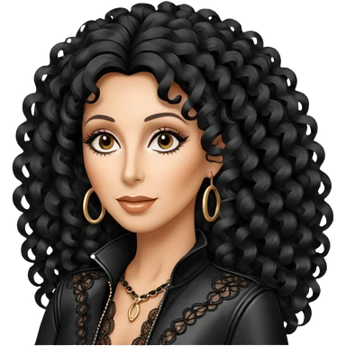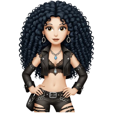 realistic cinematic singer Cher in a typical rocker's attractive outfit with leather and lace, half-naked, huge curly hair like in the video If I Could Turn Back Time emoji