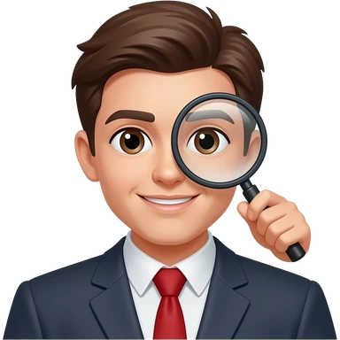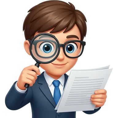 A student wearing glasses looking closely at a document with a magnifying glass emoji