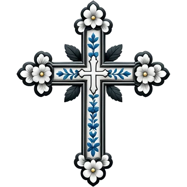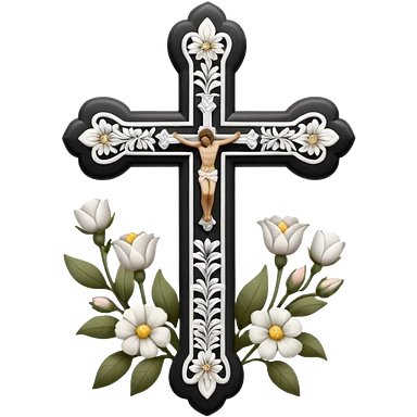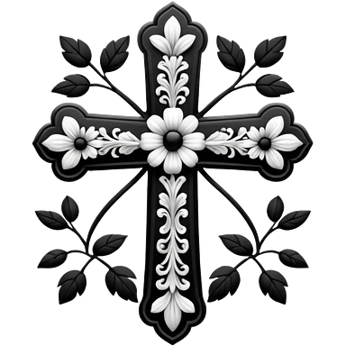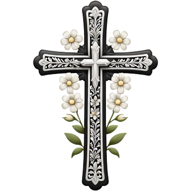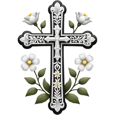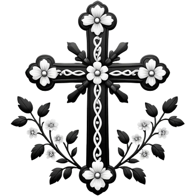 a black and white detailed cross with flowers over lapping emoji