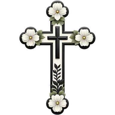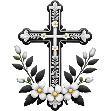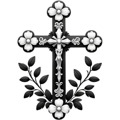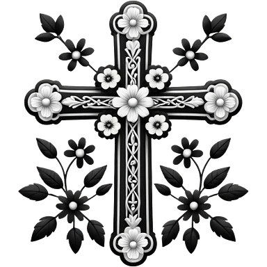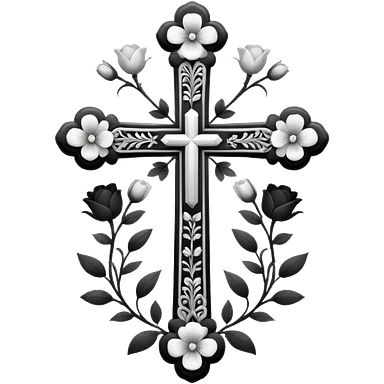 a black and white detailed cross with black and white flowers over the top emoji