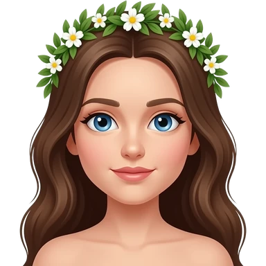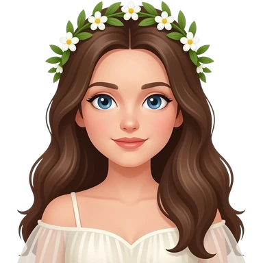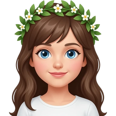 Ragazza occhi azzurri capelli castani lunghi corona alloro con fiori piccoli bianchi solo in testa emoji