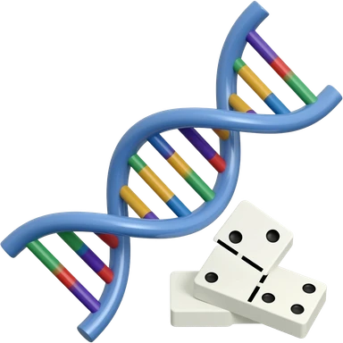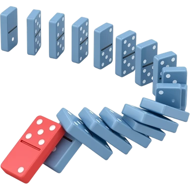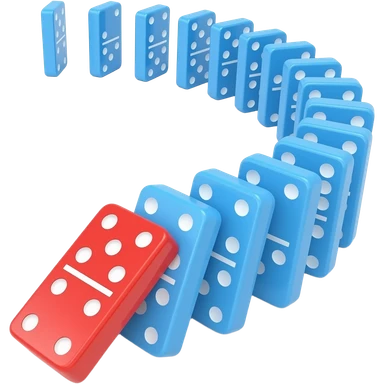 Modern 3D render of sleek dominoes falling in a chain reaction. The lead domino is red, triggering a cascade of glowing blue dominoes. Modern minimalist aesthetic, glossy finish, isometric view, soft shadows, white background. emoji