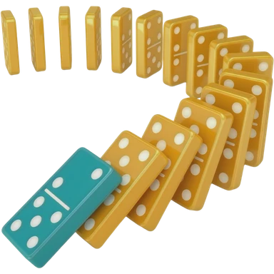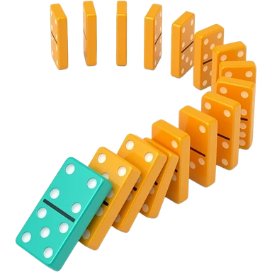 Modern 3D render of sleek dominoes falling in a chain reaction. The lead domino is teal, triggering a cascade of glowing orange dominoes. Modern minimalist aesthetic, glossy finish, isometric view, soft shadows, white background. emoji