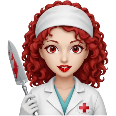 Scary woman scalpel in hand, evil surgeon sexy surgeon clothes. She has red eyes. Her brown long curly hair. Wears sexy doctor outfit with red gloves. make her hair free and brown but have mouthy wear mask to hide. Wears white surgeon jacket and has lon* brown hair. emoji