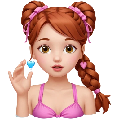 A cute ukrainian girl, with long auburn hair two side ponytails plaited, in her pink bathing costume, she's blowing a kiss. emoji