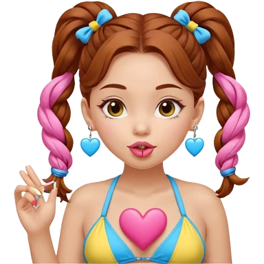 A cute ukrainian girl, looks slightly malaisain with full lips and long auburn hair in two plaited ponytails, has heart earrings in yellow and blue, and is wearing her pink bikini, she is blowing a kiss. emoji