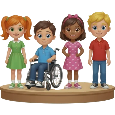 Head and shoulders (sing it) Girl with orange lower 2 ponytails and green dress boy with blue shirt and a wheelchair girl with sand skin pink bend heart dress boy with yellow hair with red shirt in a stage emoji