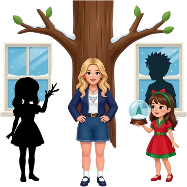 Kelly clarkson underneath The Tree Brown two brades girl with freckles with red and green dress looking for snowglobe one shadow girl with one brade and dress and one shadow boy with spiky hair and shirt in windows emoji