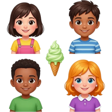 do you like broccoli ice cream One Girl Is Asian Hair And yellow shirt pink overalls One Asian Boy And brown hair Likes blue lines shirt one african boy with a green shirt one girl with freckles yellow orange hair and purple dress collar emoji