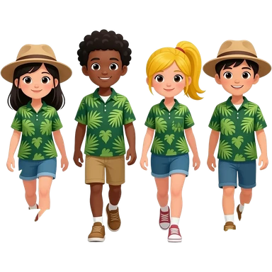 Walking in the jungle one girl with asian hair with a jungle hat shirt one boy with african style with jungle hat shirt one girl with yellow one ponytail with jungle hat shirt one asian boy with jungle hat shirt on a jungle emoji