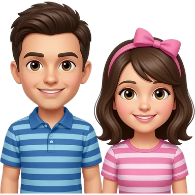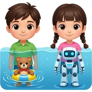This is the way little fox Boy With Asian Brown hair green collar shirt And Girl With 2 Asian brades And Pink Shirt A Teddy Swimming With A Inflatable Ring And Robot Standing up emoji