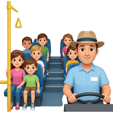 People on the bus Many children and driver hat and name shirt steer the steering wheel on the bus emoji