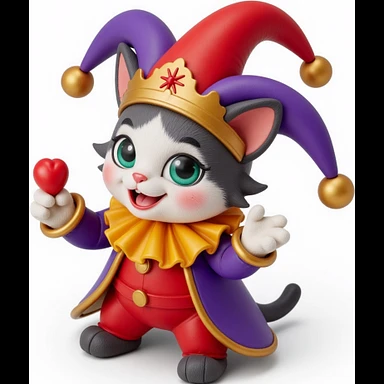crazy colorful cute little cat jolly joker from poker, medieval, vintage, court jester, mac os icon, purple, gold and red color, half body. Squared shape as 3D mac os icon, symmetrical emoji