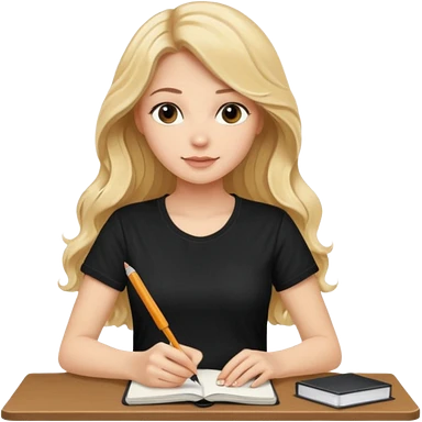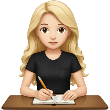 A beautiful blonde with long wavy hair in a black T-shirt sits and writes in a diary with a brown pen without table emoji