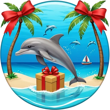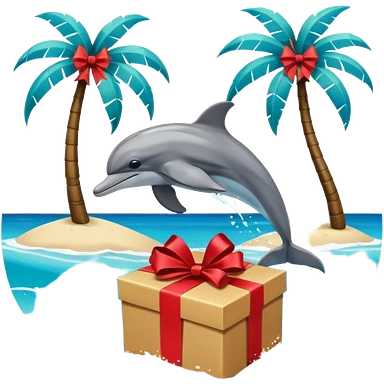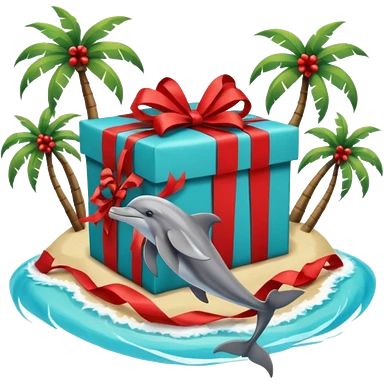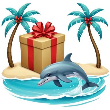 🏖️🌴🎁💝 뭐 이런거 이용해서 해변이랑 돌고래가 뛰노는 바다에 야자수가 있고 그 아래는 선물이 하나 크게 있는거야 emoji