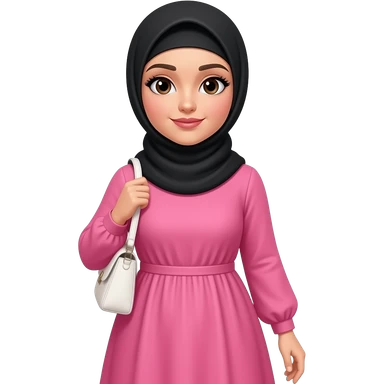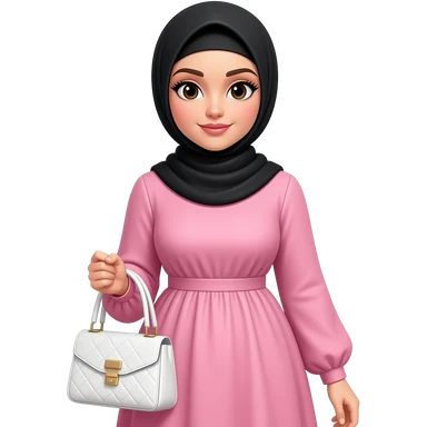 Curvy woman with pink maxi dress long sleeves, wearing a black hijab withblack hair showing at the front, she has white skin and black hair and brown eyes holds a white purse and has long black eyelashes emoji