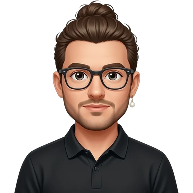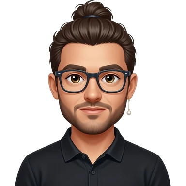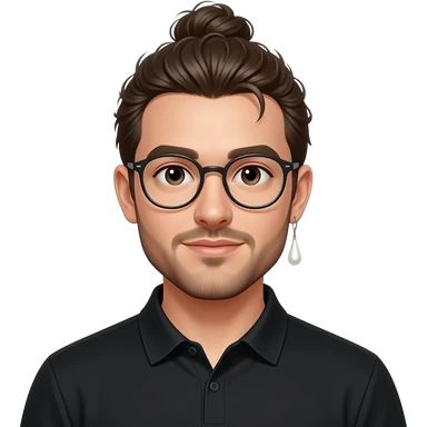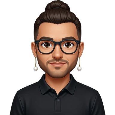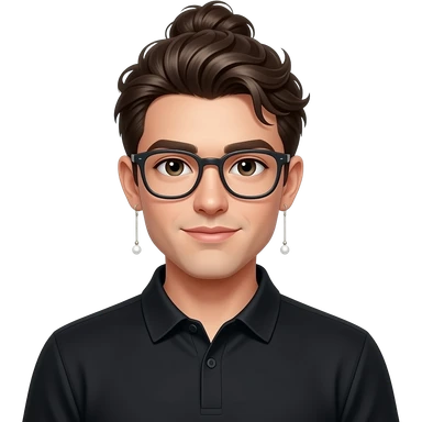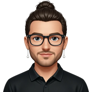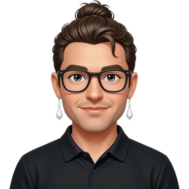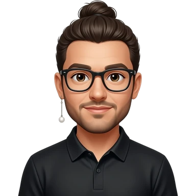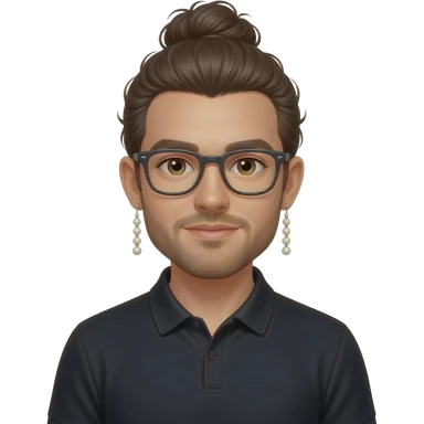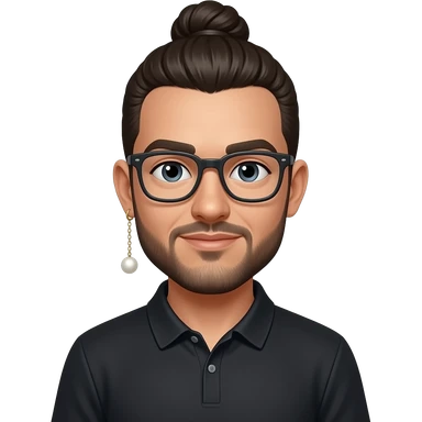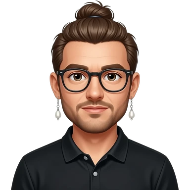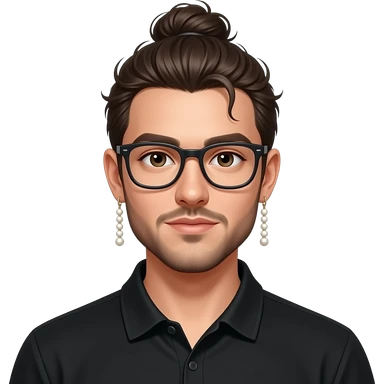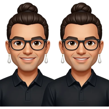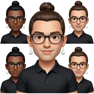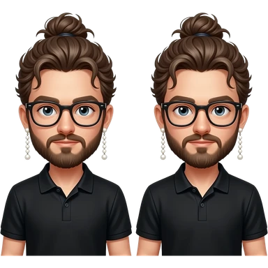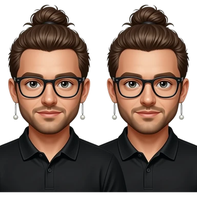 Men with a Messy bun and glasses, long earing with white pearl and black polo emoji