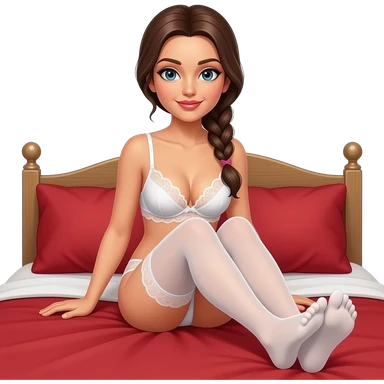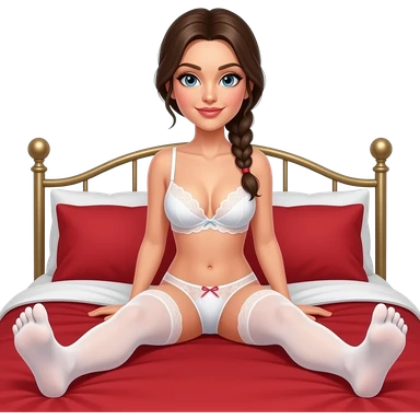 woman, in lacy white bra and thong, white hold ups, braided ponytail, sitting on red bed, lifting feet, legs apart, showing toes emoji