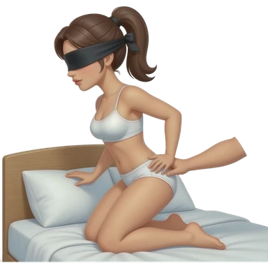 woman in blinfold, in white underwear, with ponytail, on bed, being spanked on the bottom emoji