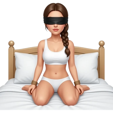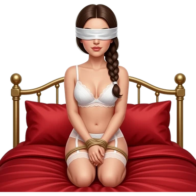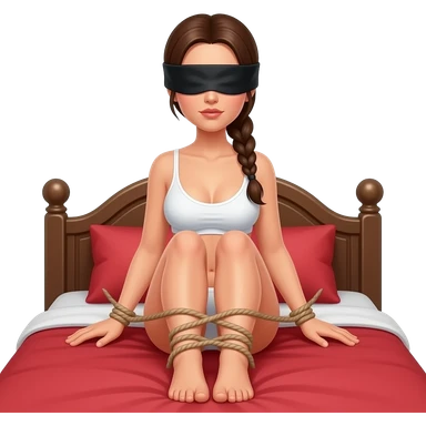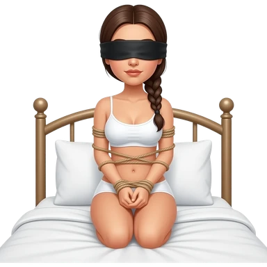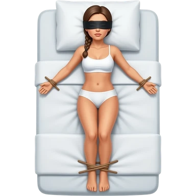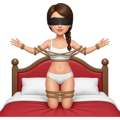 woman in blinfold, in white underwear, braided ponytail, arms and laegs tied on bed emoji
