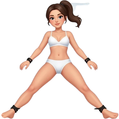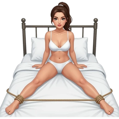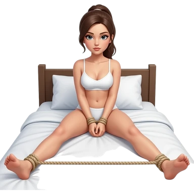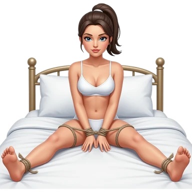 woman in white underwear with ponytail on bed with legs apart and ankles tied to thighs shibari emoji