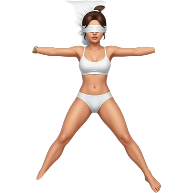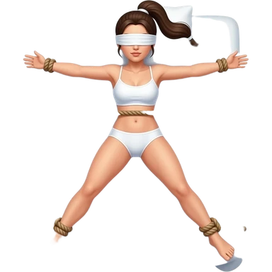 woman in blinfold, in white underwear, with ponytail, on bed, with arms and legs tied apart shibari emoji
