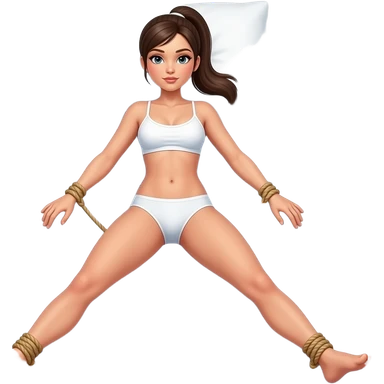 woman in white underwear with ponytail on bed with arms and legs tied with rope shibari emoji