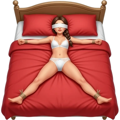 woman in blinfold, in white underwear, braided ponytail, laying down, arms and laegs tied apart, on red bed emoji