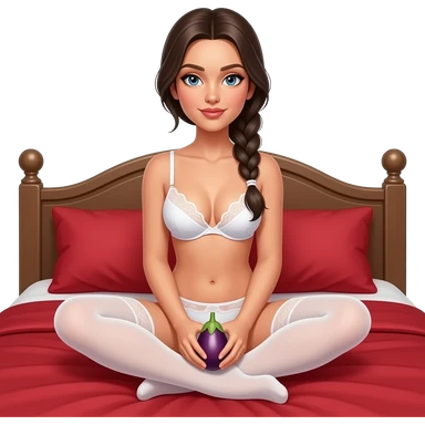 woman, in lacy white bra and thong, white hold ups, braided ponytail, sitting on red bed, hands to rear, holding aubergine between feet emoji