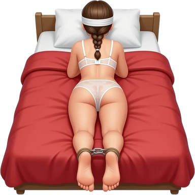 woman in blinfold, in lacy white bra and thong, braided ponytail, laying face down, face down bum up on red bed, with ankles tied emoji