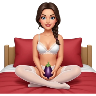 woman, in lacy white bra and thong, white hold ups, braided ponytail, sitting on red bed, holding aubergine between feet emoji
