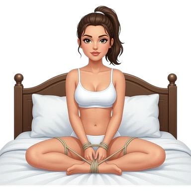 woman in white underwear with ponytail on bed with ankles tied to thighs shibari emoji
