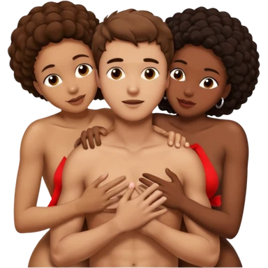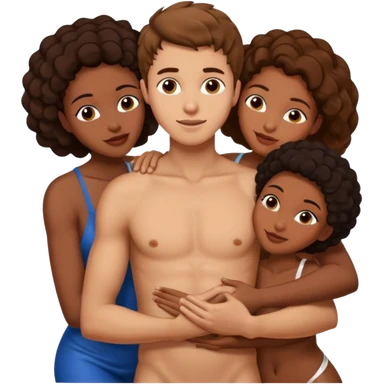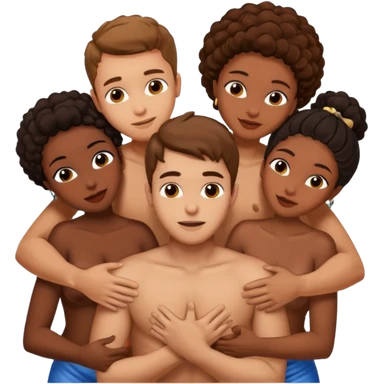 one naked american italian young brown-haired man surrounded by three naked black african women with large asses who are hugging him and each other and massaging his naked cock and balls emoji