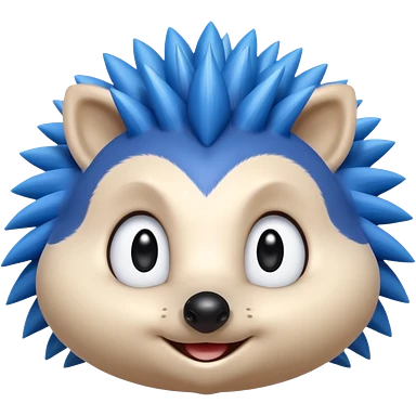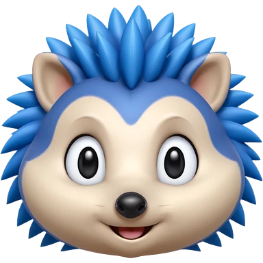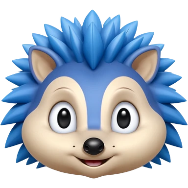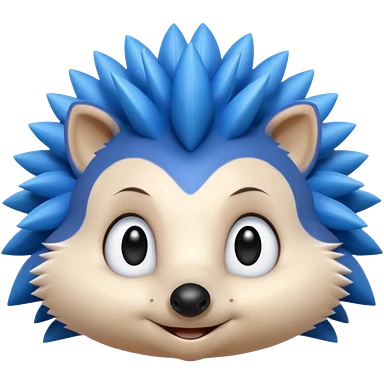 blue hedgehog emoji with long forward-facing quill spikes, smooth rounded face, large oval eyes with black pupils, small black nose, thin confident smile, 3D Apple emoji style, 1:1, clean shading, cute but energetic expression emoji
