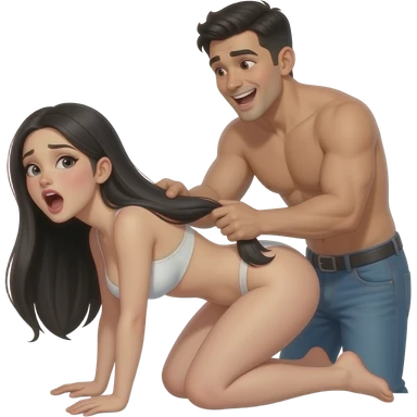 skinny young white woman with long straight black hair, fully nude, on all fours in doggy style, explicit penetration from behind, slim lightly tanned young man with short straight black hair and average body, grabbing her hair, she is moaning in pain, both naked, realistic emoji